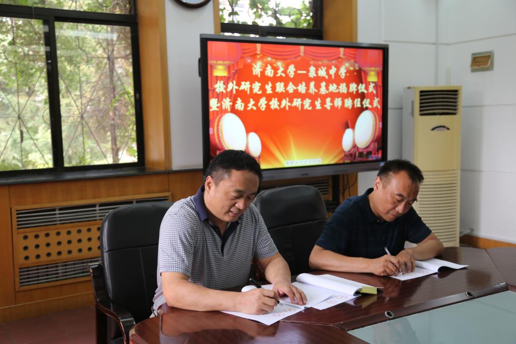 新葡萄88833官网AMG研究生院副院长张志全与泉城中学校长董晓杰共同签署了共建实习基地的协议,之后为联合培养基地共同揭牌,与会领导向泉城中学三位老师颁发了校外研究生导师聘书。泉城中学校长董晓杰表示,研究生联合培养基地的落成为泉城中学教育教学质量的提升、教师的专业发展、学校的科学发展等注入了新的活力。受聘导师表示,会严格遵守新葡萄88833官网AMG研究生校外导师相关规定,加强学习,潜心研究,认真履行导师职责,完成教育硕士的培养任务。