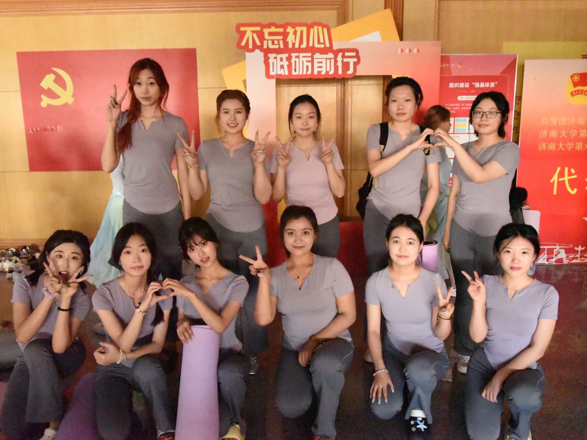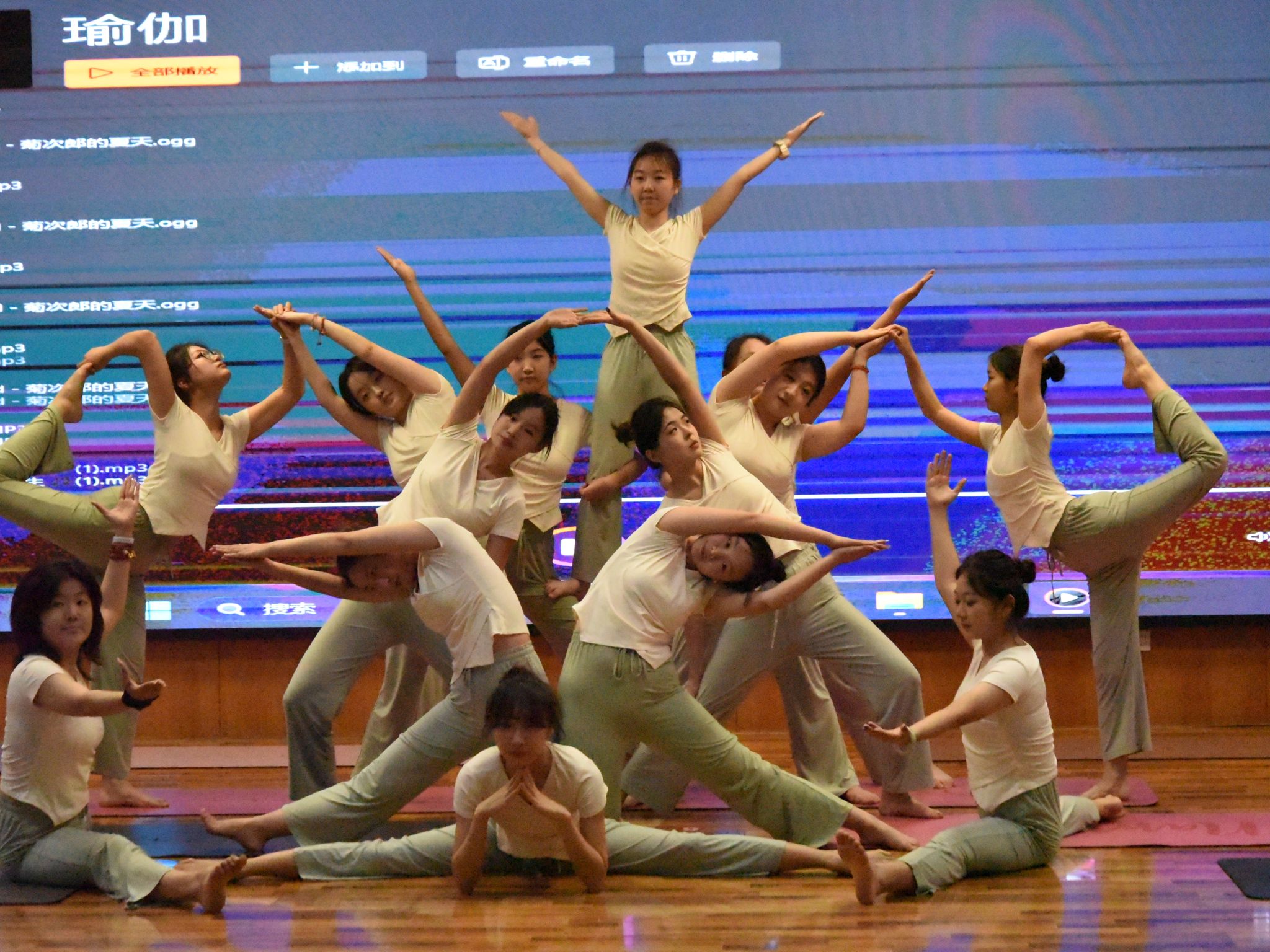 比赛现场,参赛队员身着统一服装,精神饱满、自信昂扬。随着悠扬舒缓的音乐缓缓响起,队员们开始了精彩表演。他们的动作行云流水,伸展、扭转、平衡,一招一式精准到位,将瑜伽的柔美与舞蹈的灵动完美融合。团队配合默契十足,动作整齐划一,展现了强大的凝聚力和协作能力。现场观众沉浸其中,被队员们的精彩表现所折服,掌声、喝彩声此起彼伏。此次比赛不仅将瑜伽刚柔并济之美展现得淋漓尽致,也表现出了教心学子团结一致,默契配合的团队合作精神。