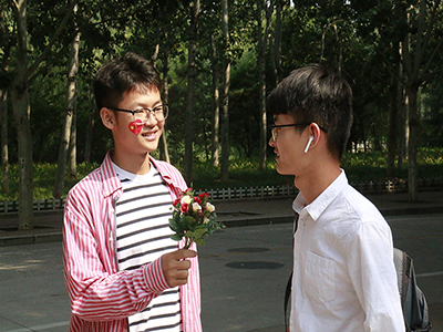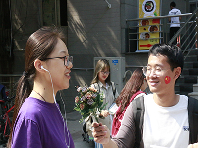志愿者们采访的最后一环是向过路师生征集一句最想对祖国母亲说的话,在十几位师生中,一句“我爱你中国”占了比例大半,简短的语句中透露出的是大家身为中国人所发自内心的自豪。采访末了,志愿者向采访师生赠与国旗、贴画等纪念礼品,为本次活动画上一个圆满的句号。