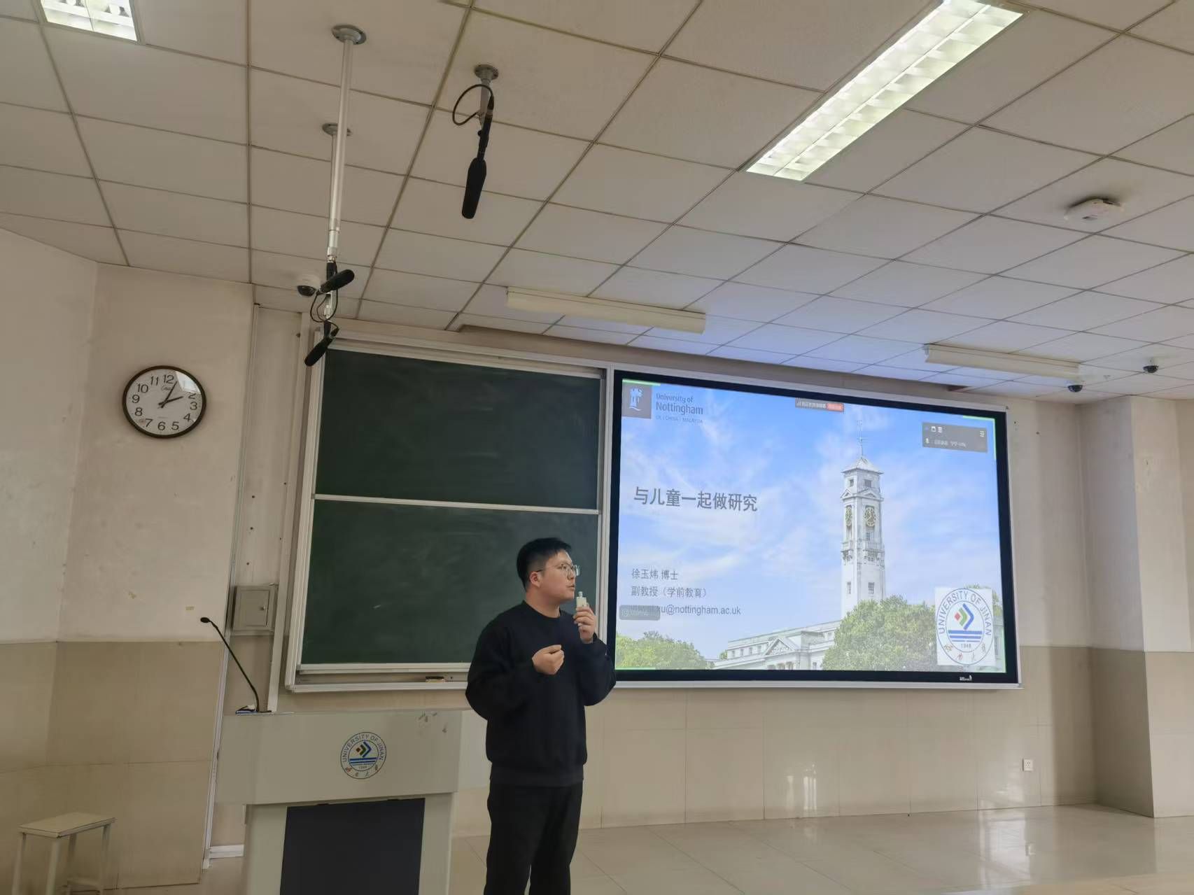 2025年4月22日下午,新葡萄官网特殊教育系邀请英国诺丁汉大学教育学院副教授徐玉炜博士举行主题讲座——“与学龄前儿童一起做研究”。本次讲座为“教育部—联合国儿童基金会中国融合教育推进:教师专业能力提升项目”新葡萄88833官网AMG试点高校项目活动,由新葡萄官网特殊教育系教师宁宁主持,特殊教育系学生和部分教师参与了本次讲座。