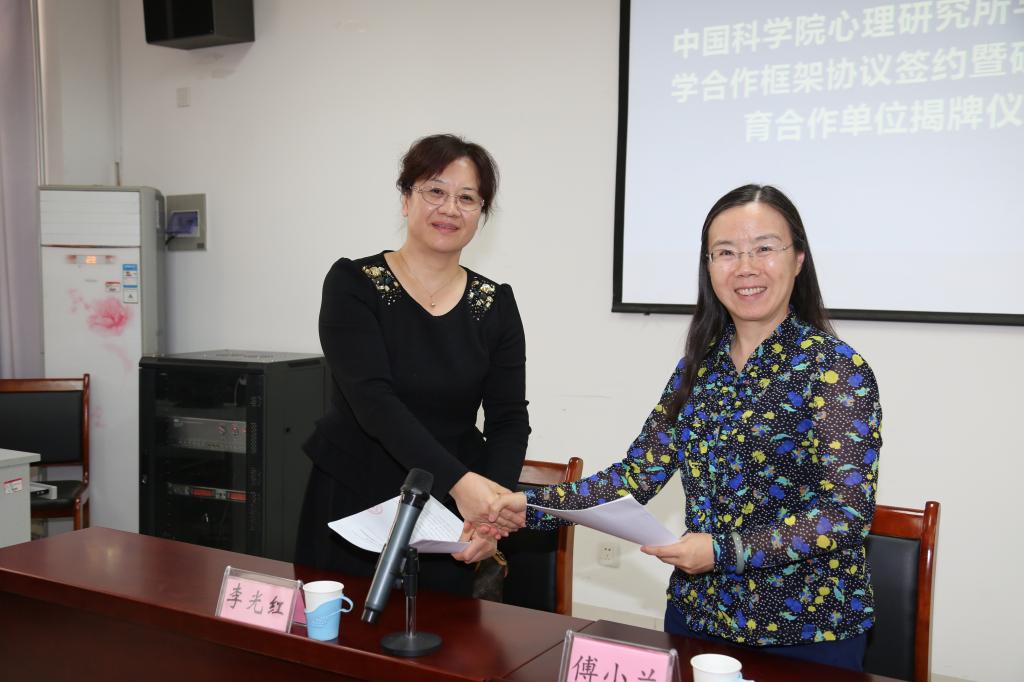 李光红副校长与傅小兰所长交换合作框架协议书,并共同为“中国科学院心理研究所研究生教育合作单位”揭牌。
