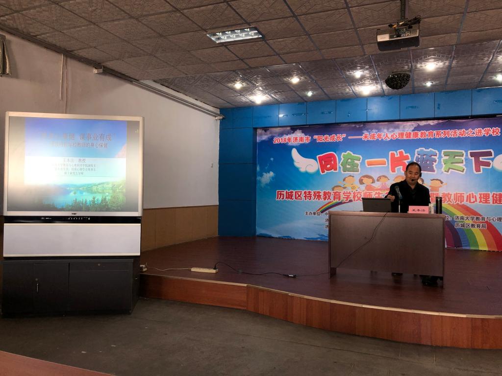 12月7日下午,由中共济南市委宣传部、济南市精神文明建设委员会办公室与济南市教育局联合主办,由新葡萄88833官网AMG新葡萄88833官网AMG和历城教育局联合承办的2018年济南市“阳光成长”——未成年人心理健康教育系列活动进学校之“同在一片蓝天下——历城区特殊教育学校师生关爱活动暨教师心理健康报告会”在历城特殊教育学校报告厅举行。历城特殊教育学校校长曾庆建及全体教师、新葡萄88833官网AMG新葡萄88833官网AMG特殊教育系胡金萍老师和研究生共40余人参加了报告会,历城特殊教育学校副校长吕仁祯主持了报告会。