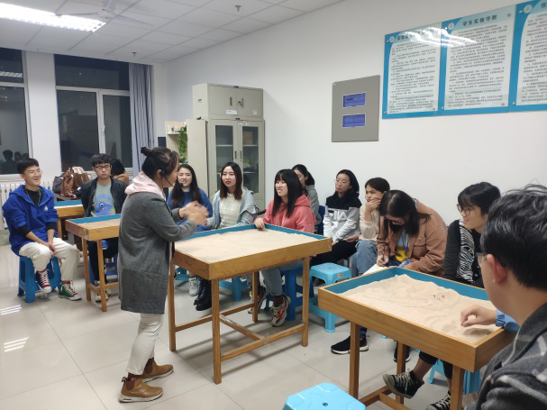 冯晶老师首先从心理学理论入手,包括荣格、曼陀罗的心理学理论。荣格的心理学理论主要讲解了集体无意识、个体无意识、意识,曼陀罗的心理学理论主要对“九宫格疗法”进行描述,使同学们对心理学的理论有了初步认识,为接下来的心理治疗方法的介绍做了铺垫。随后冯晶老师对“前世今生疗法”进行讲解,借中医心理学实例让同学们对其理解更加透彻。然后,冯晶老师着重介绍了沙盘游戏,叙述沙盘游戏的发展过程,并指出所有的艺术治疗都为辅助性的手段,之后为同学们通过实际案例分析介绍沙盘游戏的使用方法及其内涵。最后,同学们实际操作沙盘游戏,冯晶老师一一对其进行分析。