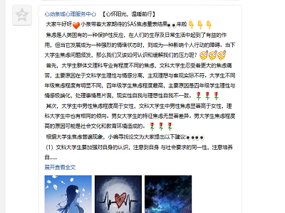 利用学院专业优势,心动泉城心理服务中心志愿者制作出一系列心理测量量表,其中包括焦虑、抑郁、安全感与孤独感等一系列的自测量表,并于3月27日公开收集信息,免费供大学生进行自我测试。新葡萄官网学生高度关注自身的心理健康情况,积极参与测试,同时期待着测量结果的推送。经过志愿者们一周的数据收集和精确分析,4月2日上午,心动泉城心理服务中心QQ推送号公布了SAS焦虑量表结果,揭示了当代大学生面临的焦虑问题,分享了焦虑方面的相关专业知识。同时也提出了缓解压力的方法与建议,以帮助当代大学生更好地了解和调节自身心理状态。