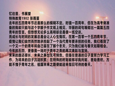 活动期间,参赛者将去年对五四的回忆和今年疫情后的展望用文字表达出来。特教1902班戴文迪同学写到,去年的五四青年节是在备战高考中度过的,虽无聊又疲惫,但是通过“借这个机会想起那段岁月,更多的是感恩和想念,很久没看到这样努力的自己了。”这句话我们能看出,高考前虽然忙碌,但又是充实与满足的一段回忆;特教1902班张雨苗谈到今年五四青年节的特殊,如她所说的“疫情让我们自然而然地承担起了一个当代青年要承担的义务”那样,我们看到了一个又一个青年将自己留在了那个冬天。今年的五四青年节,更像是一场对于青年之责的再次表彰与宣扬。经过作品收集与筛选,新葡萄88833官网AMG心泉青年志愿者协会已经对文章有了初步的选择,活动中优秀的作品将由宣发部通过微信公众号推送等各种方式进行展出。