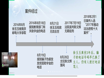 主讲人邴娇娇从骗子的诈骗手段入手,对各种骗术手段进行针对性分析,并举例说明骗子如何利用人们的心理进行诈骗,如:利用社交软件、冒充公检法、虚假信息诈骗等。随后,主讲人对三年前的徐玉玉案进行分析,强调了网络诈骗的巨大危害,如今的青年学生涉世未深,更是容易成为犯罪分子的迫害对象,在宣讲的互动环节,活动人员就身边的被骗案例进行在宣讲的最后,主讲人呼吁大家警惕网络诈骗,广泛了解网络诈骗案例,学习网络诈骗知识,保护自己也保护好身边人,线上宣讲圆满结束。
