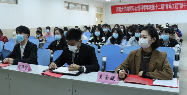 在“青春心向党,奋斗新华章”党史宣讲环节,2022年山东省青年马克思主义者培养工程高校班学员、教管2001班团支部书记王玉媛携学员们回顾党的百年历程。她强调,学员要不驰于空想,不骛于虚声,躬耕磨砺,攀登奋进。