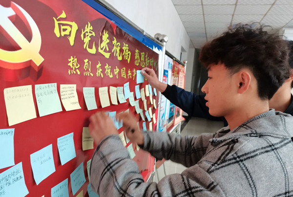 活动前期制作了祝福海报,通过beat365中文官方网站分团委、学生会向广大同学宣传,并在活动现场向前来送祝福的同学们发放便利贴,邀请他们写上对党100周年华诞的祝愿。在课间时间,同学们纷纷将对党的感恩和美好祝福通过贴便签的形式张贴在展板上,表达对党的热爱与拥护。