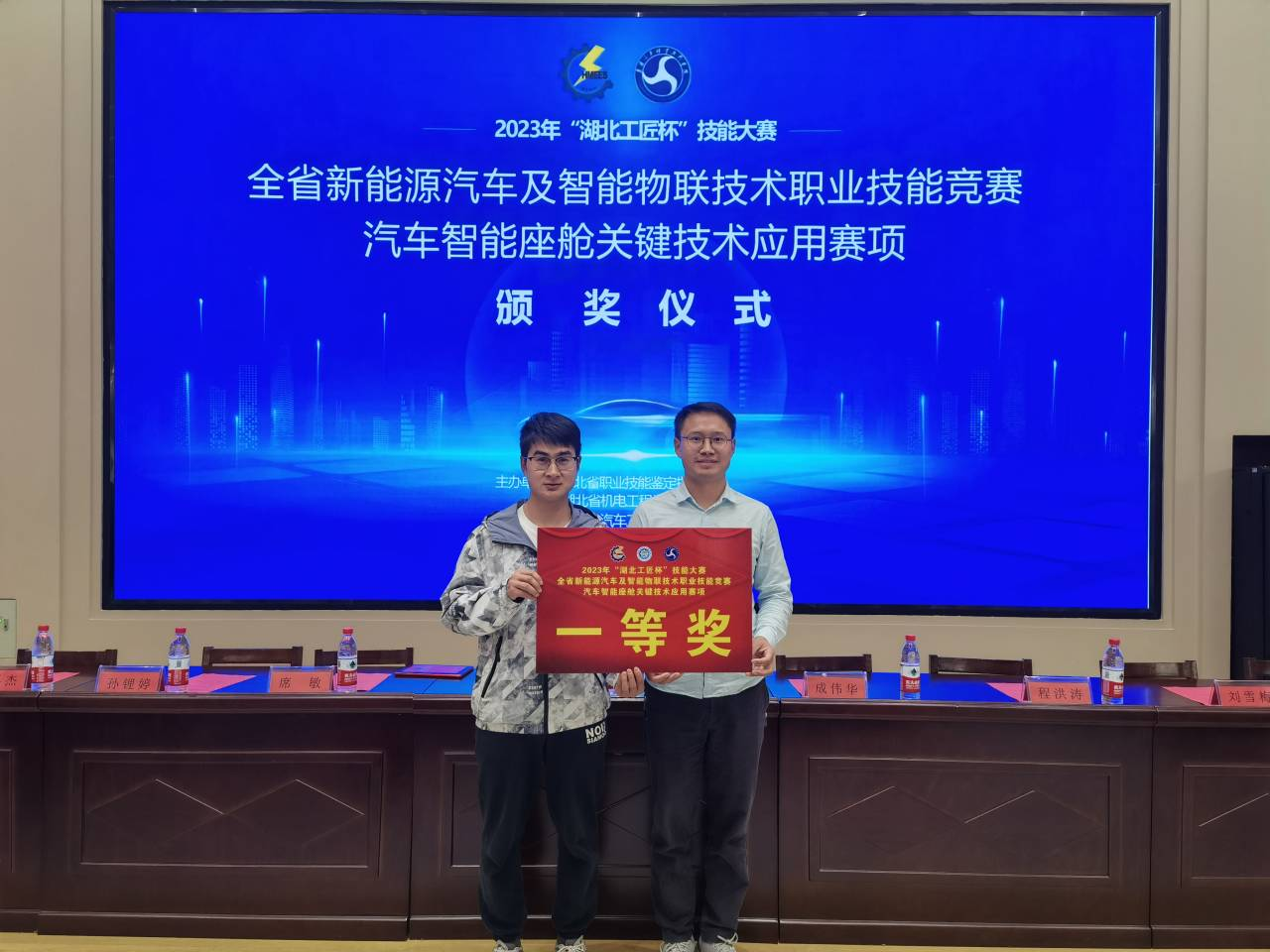 (通讯员:张超、唐晋)10月20日至22日,2023年“湖北工匠杯”技能大赛——全省新能源汽车及智能物联技术职业技能竞赛汽车智能座舱关键技术应用赛项在襄阳汽车职业技术学院举行。来自湖北省23所院校及1家企业的46支队伍,近百名参赛选手同台竞技,beat365中文官方网站教师唐晋、范伶松参加竞赛,经过激烈拼搏最终斩获一等奖。