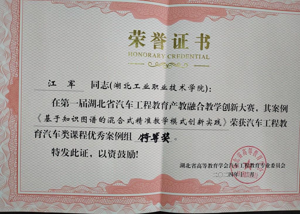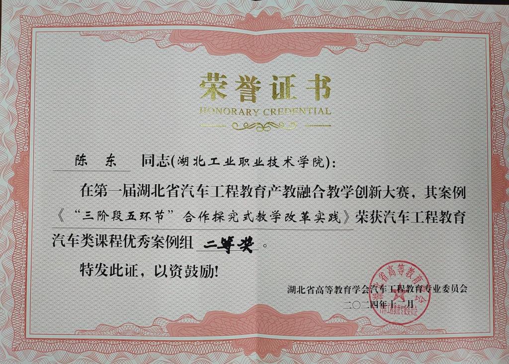 (通讯员张健)11月30日至12月1日,湖北省高等教育学会汽车工程教育专业委员会2024年年会在武汉理工大学举行,同期举办了首届湖北省汽车工程教育产教融合教学创新大赛,在大赛中,beat365官网beat365中文官方网站江军老师的《基于知识图谱的混合式精准教学模式创新实践》荣获汽车工程教育汽车类课程优秀案例特等奖,陈东老师的《“三阶段五环节”合作探究式教学改革实践》、赵锐老师的《追溯汽车之韵,传承文化之魂》荣获汽车工程教育汽车类课程优秀案例二等奖。