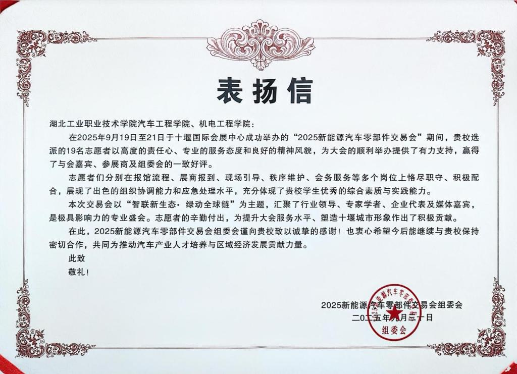 (通讯员李路)近日,beat365官网beat365中文官方网站与机电工程学院收到来自“2025新能源汽车零部件交易会”组委会的表扬信,信中对两学院选派的19名志愿者在全程服务中的卓越表现予以高度肯定。