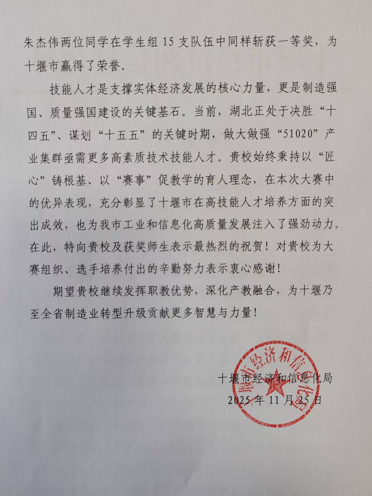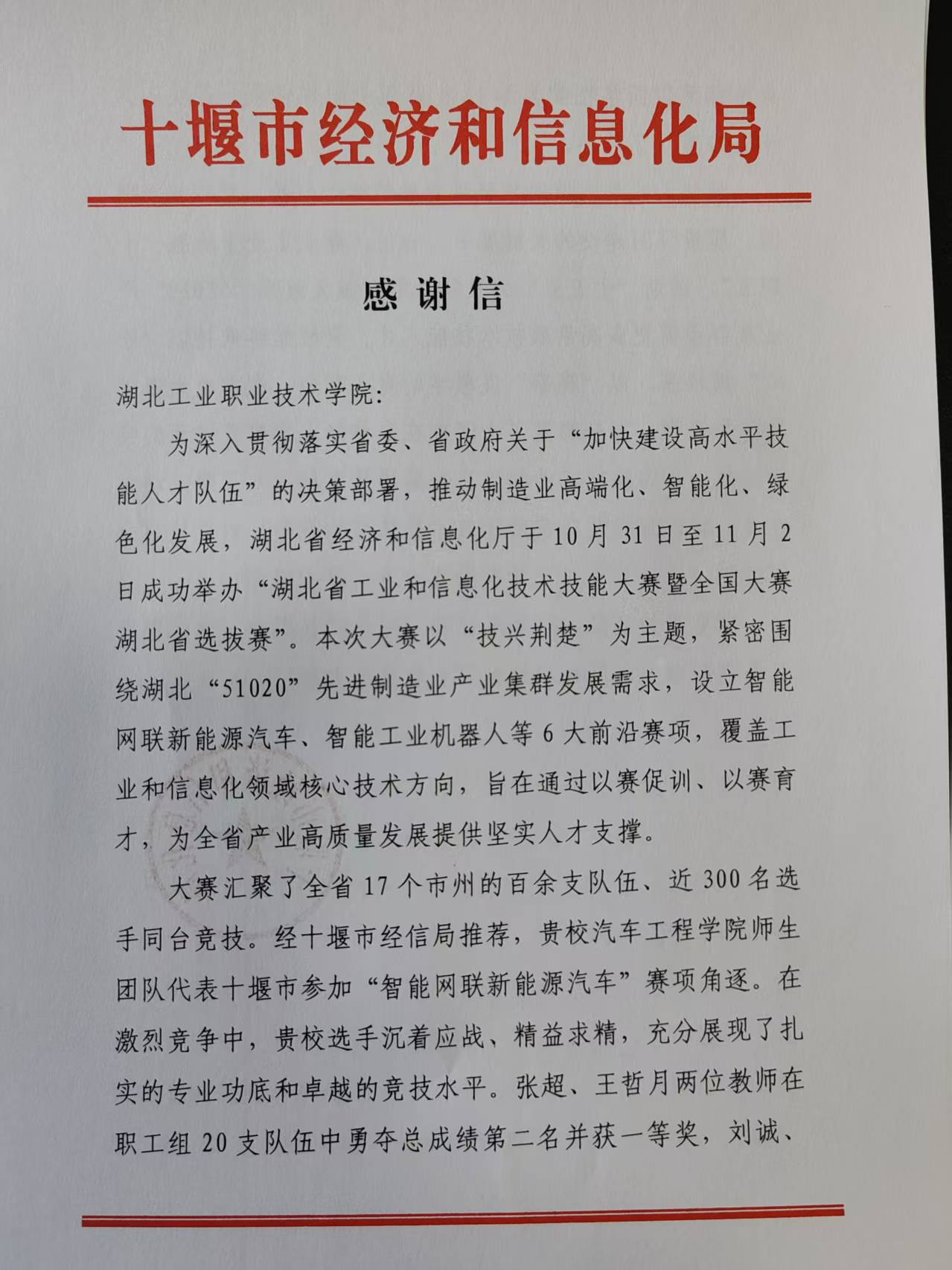 (通讯员 赵艳杰)近日,beat365官网收到十堰市经济和信息化局发来的感谢信,对beat365官网在“湖北省工业和信息化技术技能大赛暨全国大赛湖北省选拔赛”中给予的大力支持表示衷心感谢,对张超、王哲月两位教师以及刘诚、朱杰伟两位同学取得的优异成绩表示热烈祝贺。